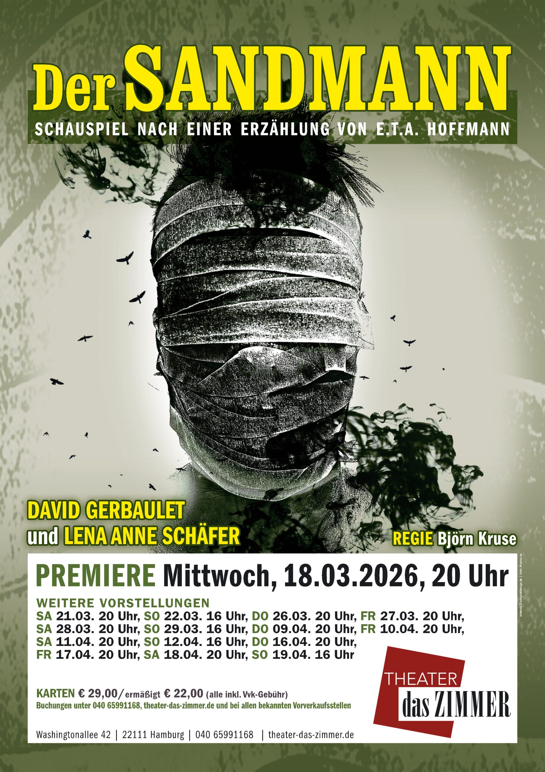 Preisträger Björn Kruse inszeniert wieder an Hamburgs kleinstem Theater. Nachdem er für seine Regie von MICHAEL KOHLHAAS mit dem Theaterpreis Hamburg Rolf Mares ausgezeichnet wurde, probt er derzeit DER SANDMANN nach einer Erzählung von E.T.A. Hoffmann bei uns. Ab dem 18. März sind dann Lena Anne Schäfer („Venus im Pelz“, „Lysistrata“) und erstmals David Gerbaulet auf unserer Bühne zu sehen.